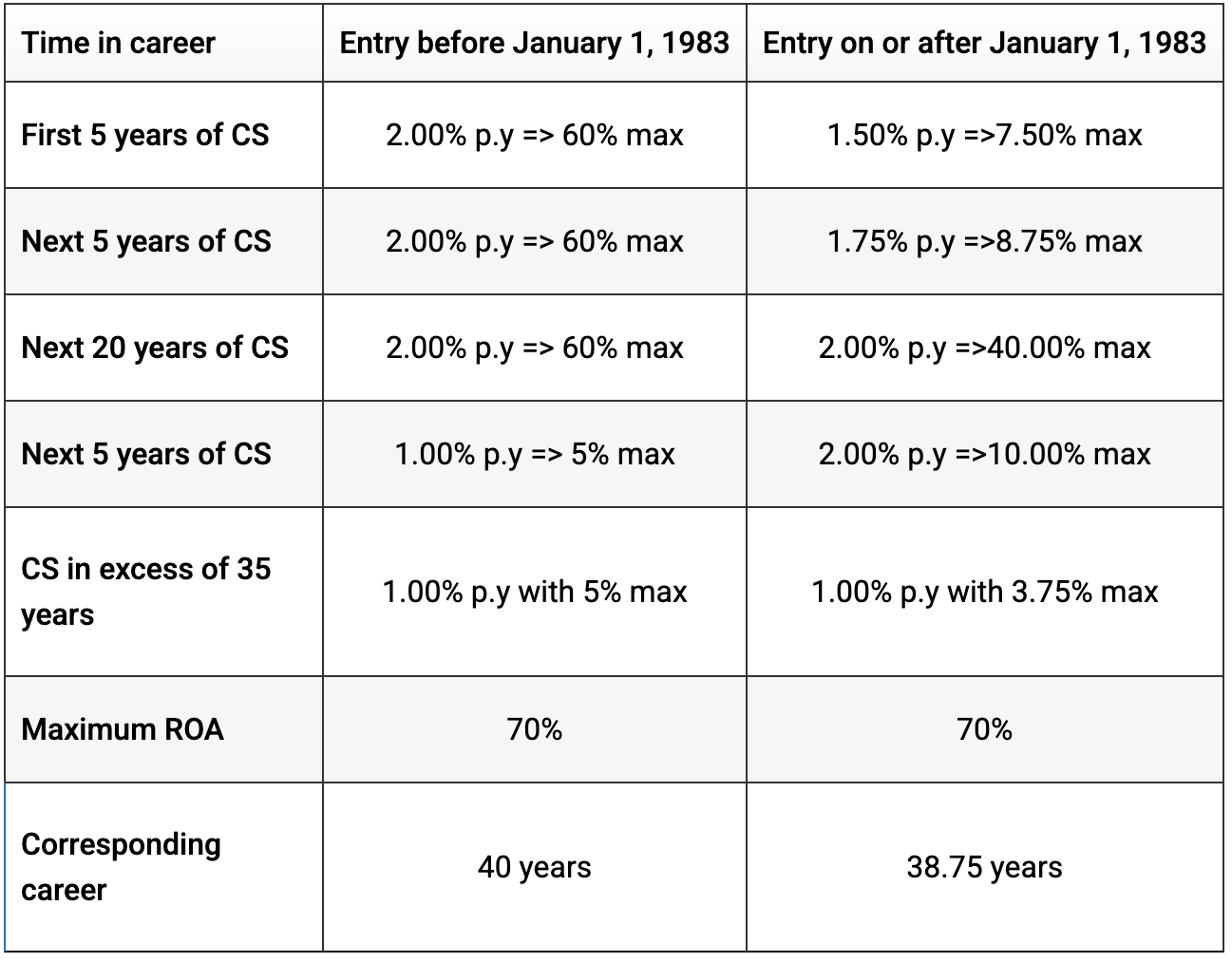 The standard rate of accumulation (RoA) is the rate at which you acquire your retirement benefit, which accumulates for each year of contributory service (CS). The standard rate of accumulation is determined by your date of entry into the Fund. The maximum standard rate of accumulation attainable is 70% of your Final Average Remuneration (FAR).