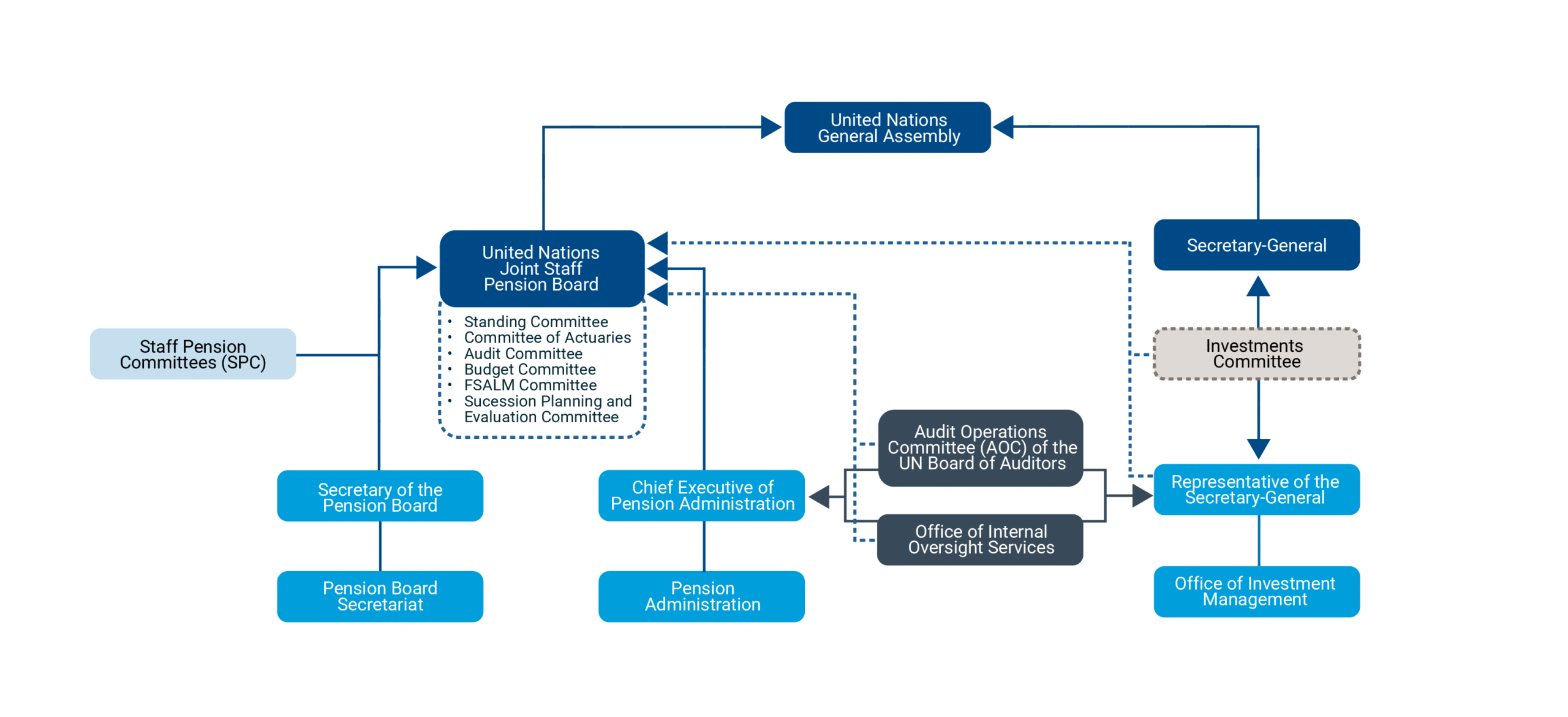 En tant qu’entité interinstitutionnelle indépendante, la Caisse fonctionne selon ses propres Statuts et Règlements approuvés par l’Assemblée générale et, conformément à sa structure de gouvernance, elle est administrée par le Comité mixte de la Caisse commune des pensions du personnel des Nations Unies, composé actuellement de 33 membres représentant 25 organisations affiliées.
