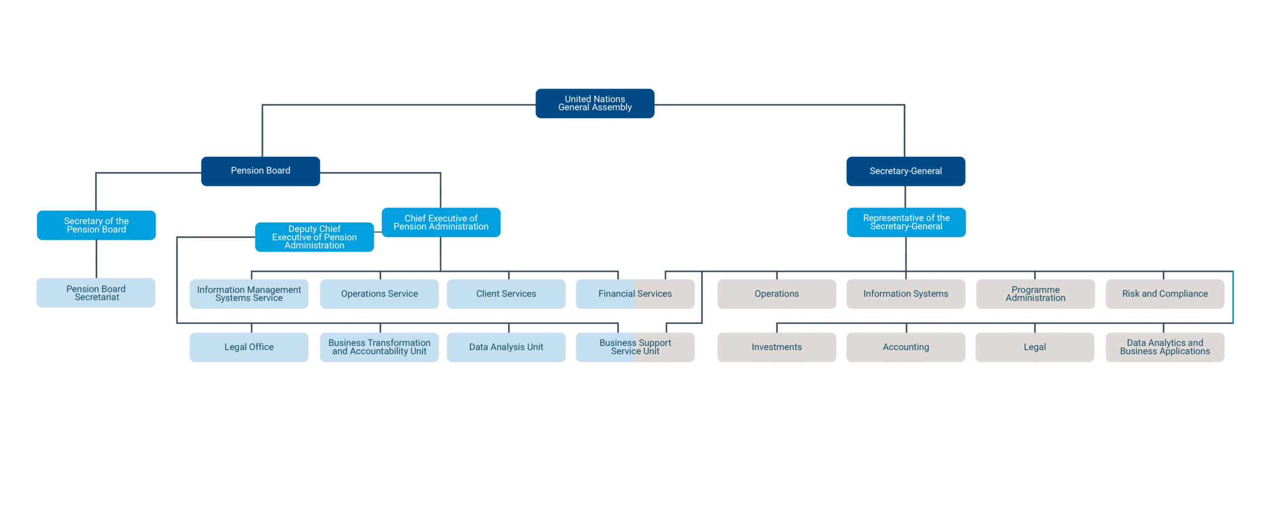 Sous l'autorité du Comité mixte, l'Administratrice des pensions est responsable de la gestion de l'ensemble de l'administration des pensions. L’Administrateur des pensions adjoint, supervise directement le Groupe des services d’appui, le Groupe de l’analyse des données, le Bureau des affaires juridiques, le Groupe de la transformation opérationnelle et le Groupe de la gestion des risques.